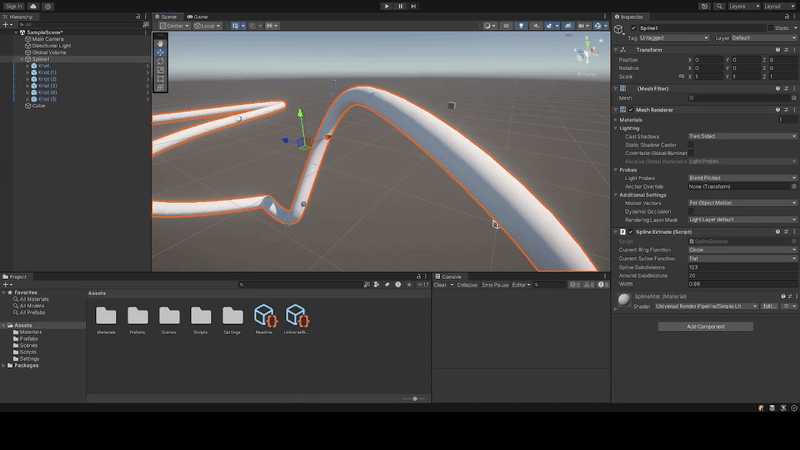 - Supports dynamically regenerating meshes at runtime allowing for changes to the spline position, subdivisions, and shape around the spline